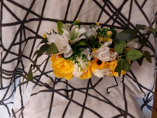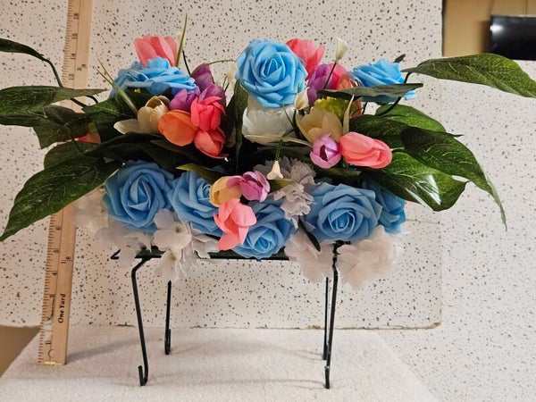 Unique and colourful flowers are fastened to the foam cage at the top of the cemetery saddle. Saddles are designed to fit top of headstones. Flowers are available in a variety of materials: silk, uv protected, foam and includes greenery. In addition flowers are available in a variety of colours for you to choose from. Arrangements stay lovely for multiple seasons.